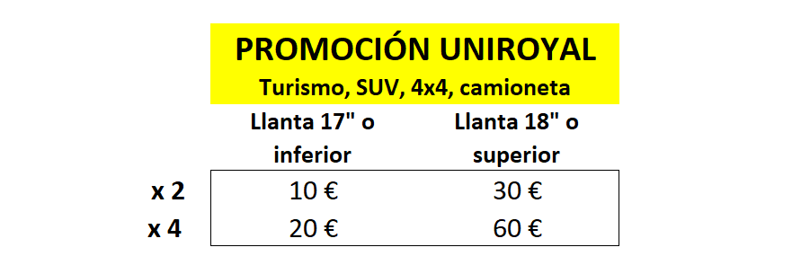 Por compra y montaje de neumáticos de turismo, 4x4 y furgoneta, de 2 ó 4 neumáticos marca UNIROYAL, de dimensión 17" o inferior o 18" o superior, el cliente recibirá un cheque carburante de 10€ mínimo a 60€ máximo. Promoción acumulable a otras promociones de descuento directo en factura o colectivos. Promoción no acumulable a otras promociones de cheque regalo.